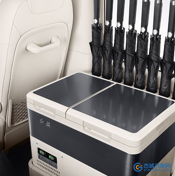 红旗国悦在配置与细节方面全部拉满,不仅拥有35L的超大容量车载冰箱、220V电源接口还有非常贴心的折叠秘书桌以及雨伞槽设计。