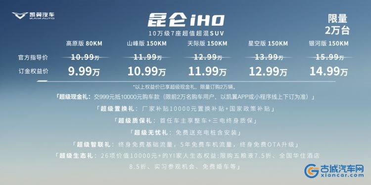更让消费者欣喜的是,凯翼汽车在昆仑iHD的定价上充分考虑了市场竞争和消费者的实际需求。相较于市场上其他同类型的混合动力车型,昆仑iHD在售价上表现得极具竞争力,上市起售价仅9.99万元。同时,凯翼汽车还提供了多样化的金融政策和灵活的购车方案,降低了消费者的购车门槛,使更多人能够享受到混合动力技术带来的超值体验。