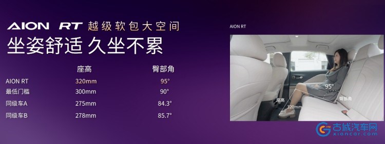 为了提升乘坐舒适性,AION RT带来越级软包大空间。舒适不是简单的主观感受,而是有严格的产品标准。要想后排舒适,座椅座高300mm、臀部角90°是最低门槛。而AION RT座高达到320mm,臀部角接近95°,表现相当不错。