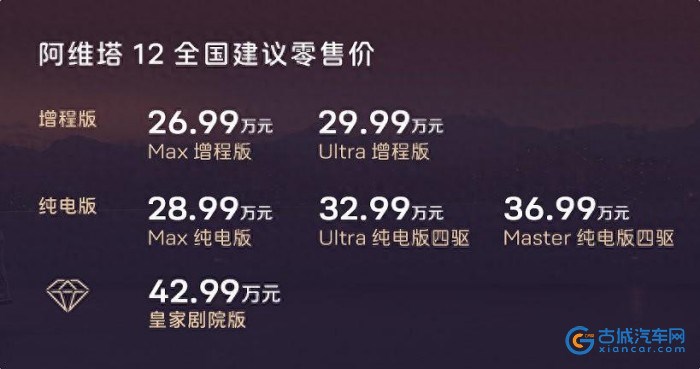 古城汽车网讯 2024年11月2日(重庆),阿维塔科技宣布,未来智能豪华轿车——阿维塔12双动力正式上市。新车共推出纯电、增程两种动力共六款车型,官方售价26.99万元起;皇家剧院版售价42.99万元。即日起,用户可通过阿维塔App、阿维塔官网、阿维塔小程序以及全国各大城市的门店等官方渠道进行订购,上市即交付。