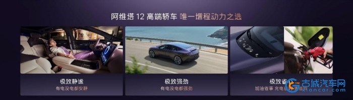 作为昆仑增程技术落地的第二款产品,阿维塔12增程车型将是行业首款高端增程轿车,满足了用户更多元、更高品质的出行需求。新车采用了全栈自研的昆仑增程技术,搭配宁德时代39kWh骁遥超级增·混电池,带来了媲美纯电车型的极致强劲、极致静谧和极致省心的用车体验。在动力方面,阿维塔12增程版馈电百公里加速7.2秒,与满电相比仅差0.5秒,增程领域衰减最低;同时,阿维塔12增程版可实现行业最强连续25次加速不衰减。在静谧性方面,通过全球首发电子机油泵、同级独有停机活塞主动控制、行业最强电驱降噪等全新技术的应用,带来了怠速37.7dB、120km/h低至64.7db的静音表现。续航方面,纯电最高可达245km、综合续航高达1155km、WLTC工况馈电油耗低至5.8L/100km。阿维塔12增程车型还是行业唯一可加92号汽油的增程汽车。