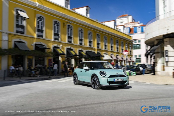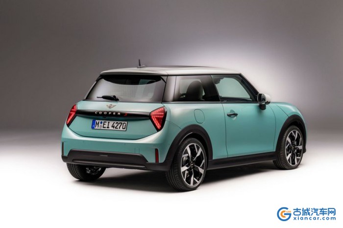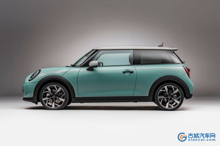 新车侧面造型较为流畅,略微向外凸出的轮拱搭配大尺寸多辐式轮圈运动感十足。另外,全新MINI Cooper依旧采用异色车顶及外后视镜设计,进一步提升其时尚感。