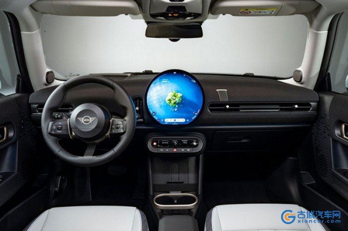内饰方面,全新MINI Cooper内部采用较为简洁的设计风格,并取消了传统的仪表盘设计,转而采用HUD抬头显示系统,搭配尺寸更大的圆形中控屏幕和双辐式多功能方向盘科技感十足。另外,该车还在中控台及门板等处使用环保织物材质进行包覆。