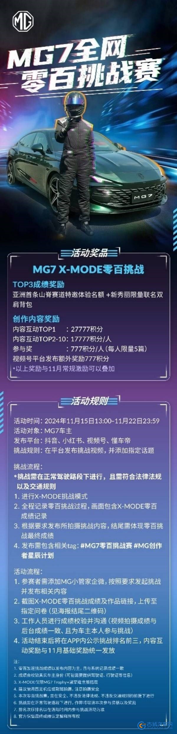 通过本次重磅更新,MG7 2025款真正实现了高速路网的全覆盖、不降级,性能卓越、稳定性强。事实上,MG7 2025款作为MG7的进阶之作,传承了MG7卓越的操控基因。其零百加速低至6.5S。同时,该车配备mCDC智能可调电控悬架,即便应对碎石烂路等复杂路况也能轻松驾驭;E-LSD电子限滑差速器可避免打滑与横摆;加之X-Mode超级玩家模式,为用户带来更为纯粹的驾驶乐趣。MG聚焦用户热衷的X-Mode超级玩家模式,重磅推出MG7全网零百挑战赛活动,即日起,用户可通过抖音、小红书等平台参与挑战,获取大额积分奖励。赛事成绩榜单的前三名优胜者,还将获得亚洲首条山脊赛道的特邀体验名额,在专业赛道上体验飞驰人生。