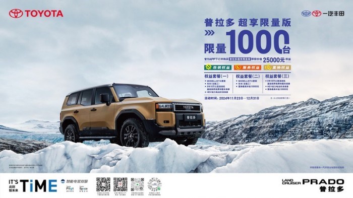 古城汽车网讯 日前,一汽丰田全新普拉多超享限量版发布,官方指导价51.98万元,超享限量版提供5座和6座两种选择,并推出价值25000元的权益。活动截至12月31日,限量发布1000台,即刻起优先抢购专属购车礼遇。
