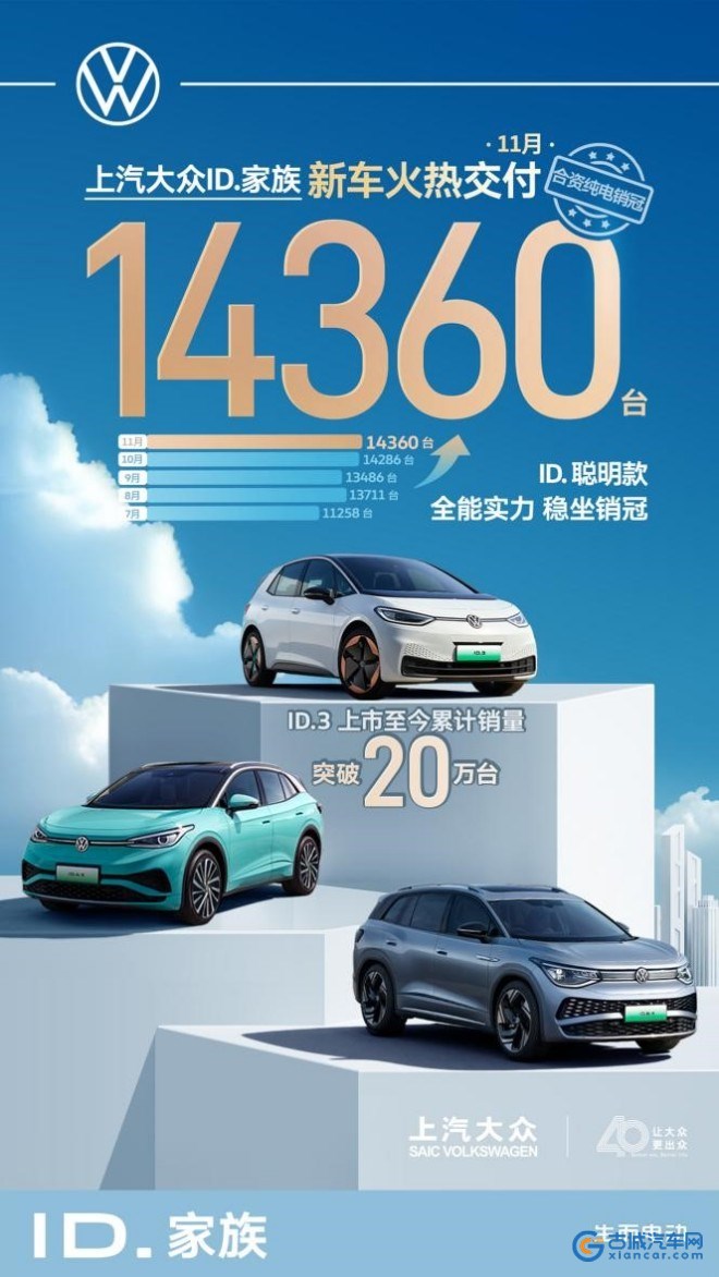 古城汽车网讯 2024年11月,全国各地速冻式入冬,而车市呈现年终火热景象,终端表现良好。上汽大众ID.家族延续金九银十的上扬态势,11月单月新车交付达14360辆,稳坐合资纯电销冠宝座。其中,大单品ID.3持续旺销,其自2021年底上市以来,累计销量已正式突破20万辆。