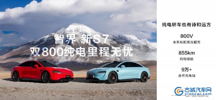 纯电轿车也有诗和远方,智界新S7全系标配800V高压超充,CLTC综合续航里程最高达855km[8],双800纯电无忧出行。