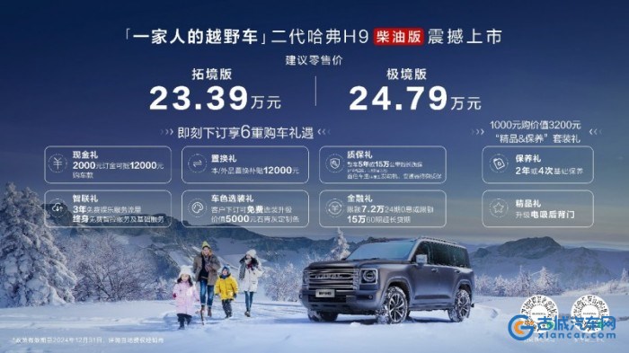 二代哈弗H9柴油版有两个版本,其中拓境版售价23.39万元、极境版售价24.79万元,享受2000元抵12000元购车款+12000元置换补贴等6重壕礼。