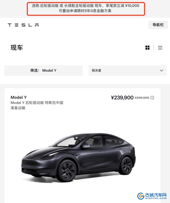 古城汽车网讯 12月24日,特斯拉中国官网上线“选购现车尾款立减”活动政策,选购Model Y现车享尾款立减10000元,叠加截止至2025年1月31日的“5年0息金融方案”,让全国各地交付中心的火爆销售热潮再加码。