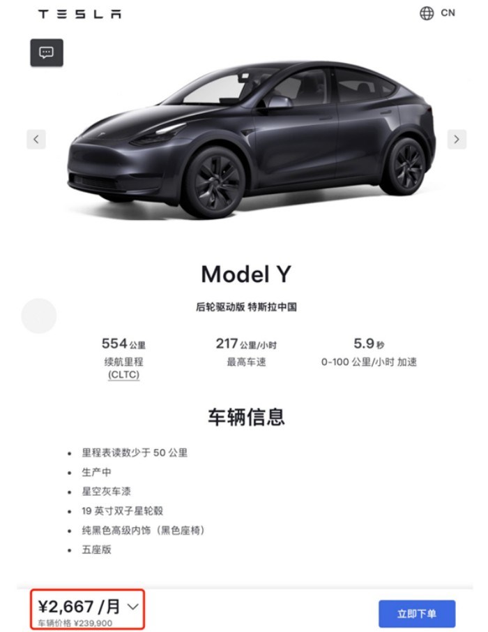 特斯拉中国官网显示,现在入手Model Y后轮驱动版及长续航全轮驱动版现车,售价23.99万元起,同时还能申请5年0息金融方案。这意味着,每月仅需2667元起,就能拥有一台全球销冠车型!