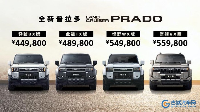 古城汽车网讯 2月26日,一汽丰田在上海举办了主题为“认真的人生终将普拉多”的全新普拉多旗舰VX版上市发布会。伴随更高级的旗舰版的到来,全新普拉多形成了包括旗舰VX版、悍野WX版、全能TX版、穿越BX版在内覆盖出行全场景的四款产品矩阵,官方指导价分别为55.98万元、54.98万元、48.98万元、44.98万元。
