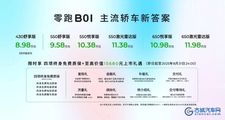 同时,自零跑B01正式上市发布至2025年8月31日24点,用户通过零跑官方 APP、小程序及官网支付5000元定金完成定购,即可享受以下权益:质保礼、复购礼、金融礼、补能礼、交付礼、流量礼、缤纷礼、转介绍礼、交付等待礼。