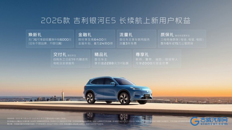 古城汽车网讯 日前,2026款吉利银河E5正式上市,新车共推出5款车型,售价区间为10.98-14.58万元。与此同时,新车还同步推出了丰厚的购车权益。