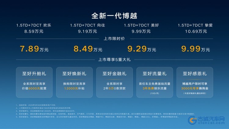 此次上市,全新博越共推出欢乐、向往、美好、挚爱四大版型,享受“1000元订金抵8000元购车金”的至好现金礼之后,上市限时价7.89-9.99万元。为感恩回馈用户,除了至好现金礼之外,吉利还推出包含至好升舱礼、至好焕新礼、至好金融礼、至好流量礼和至好感恩礼等在内的上市尊享五重大礼(2025年9月30日前购车可享),包括全系限时至高享价值6000元配置,换购限时至高享12000万补贴,全系限时享2年5万0息贷款,首任车主免费基础流量、3年免费娱乐流量(10G/月)。同时,吉利汽车还专门为博越车主准备了一份“博越换博越”至好感恩礼,博越用户换购全新博越,限时可享3000元专属换购金(与至好焕新礼叠加享受),丰厚福利一步到位,让家庭用户能轻松拥有这款“快乐座驾”。