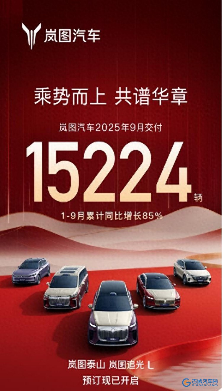 古城汽车网讯 10月1日,岚图汽车公布9月交付数据。2025年9月,岚图汽车单月交付达15224辆,同比增长52%;2025年1-9月,岚图汽车累计交付达96992辆,同比增长85%,连续七个月销量过万并实现“八连涨”。作为央企东风汽车倾力打造的高端智慧新能源品牌,岚图汽车在新能源赛道上加速奔跑,9月接连推出“三旗舰”——2026款岚图梦想家、岚图追光L、岚图泰山,加速布局明星产品矩阵,市场反响热烈,并完成股份制改造,港股上市进程稳步推进,进一步释放品牌价值与发展潜力,持续打造央国企高端新能源第一品牌。