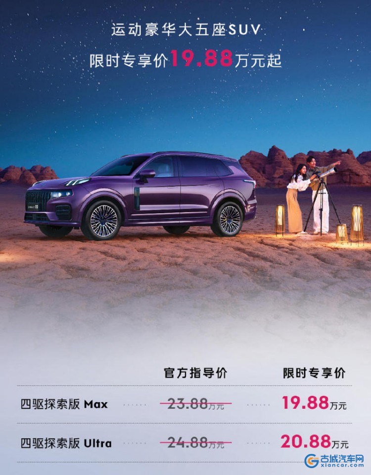 古城汽车网讯 10月23日,2026款领克09四驱探索版正式上市,新车共推出2款车型,官方指导价23.88万-24.88万元,限时专享价19.88万-20.88万元。与此同时,新车下订限时享40,000元购车补贴,“15万5年贷3年0息”金融方案。