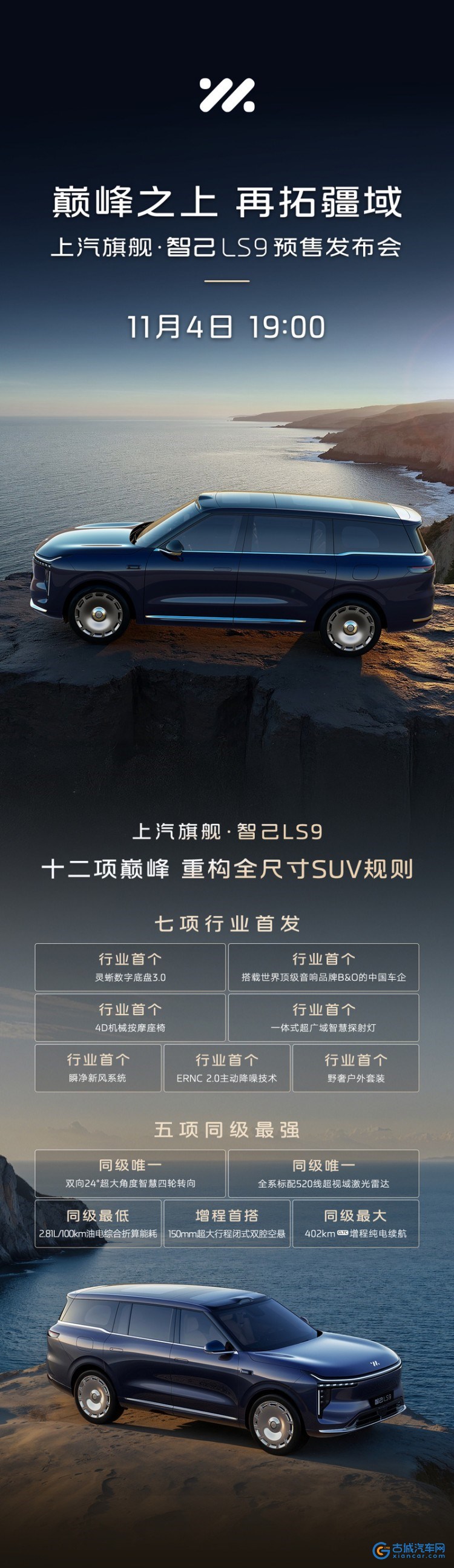古城汽车网讯 10月27日,智己汽车官宣,旗下全新车型——智己LS9将于11月4日发布,新车新车定位旗舰大六座SUV,搭载智己“恒星”超级增程系统,纯电续航可达402km。此外,新车还全系标配520线超视域激光雷达。据悉,智己LS9将在四季度正式上市。