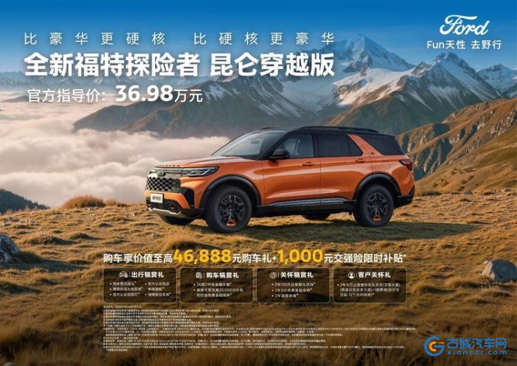 古城汽车网讯 日前,全新福特探险者昆仑穿越版正式上市,官方指导价36.98万元。新车的推出使福特探险者昆仑谱系完成5/6/7座布局全覆盖。全新福特探险者昆仑穿越版作为新增车型,新车搭载2.3T+10AT黄金动力组合,并配备托森B型限滑后差速器+全地形轮胎,以及高强度金属材质底盘装甲,使其拥有“全场景穿越”的实力。