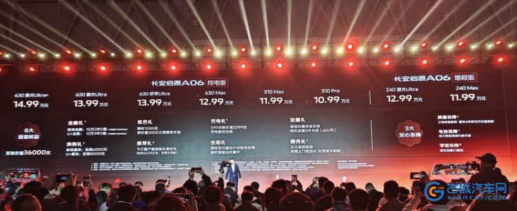 古城汽车网讯 11月9日,长安启源A06正式上市,共推出8车型,售价区间为10.99万元-14.99万元。新车基于长安SDA全球纯电架构打造,定位“大美舒享新家轿”,提供纯电、增程两种动力版本。纯电版CLTC 工况下续航里程为510km和630km;增程版CLTC工况下纯电续航为240km,综合续航超2000km,亏电油耗5.2L/100km。