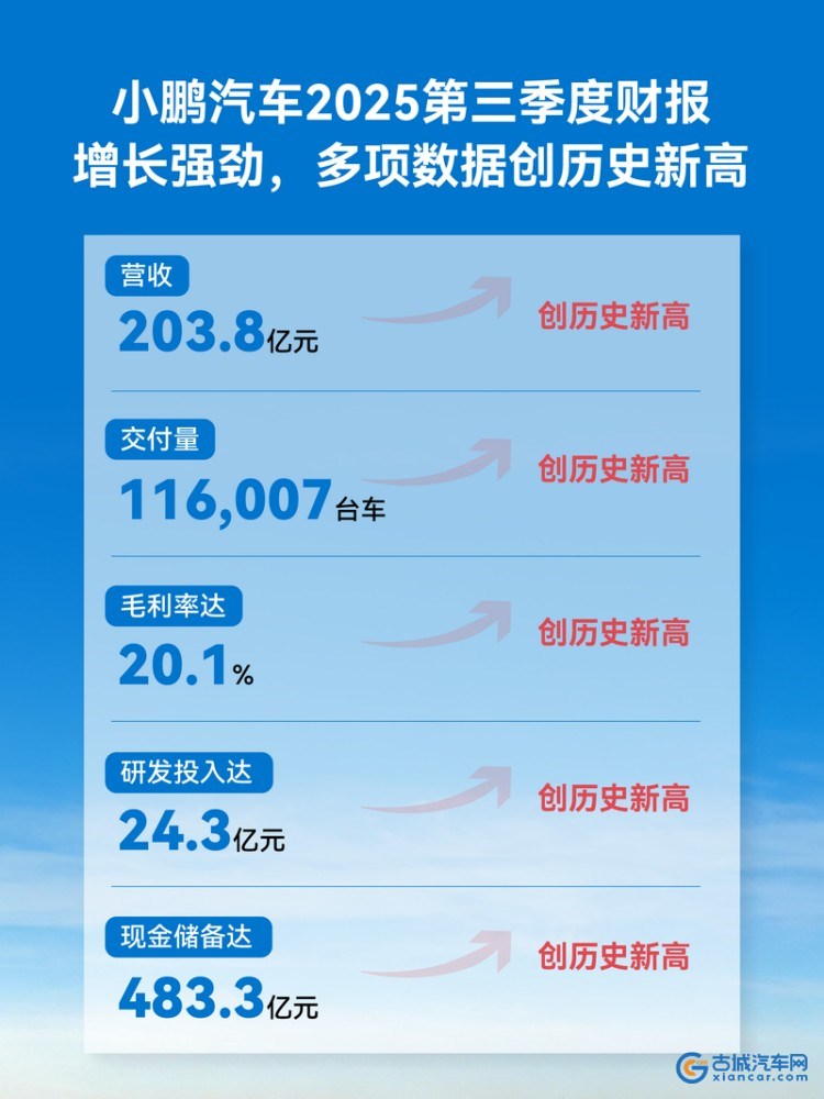 财报显示,小鹏汽车第三季度总营收为203.8亿元,较2024年同期上升101.8%;总交付量达116,007台,同比增长149.3%,创下单季度交付历史新高;毛利率达20.1%,同比提升4.8个百分点,创下单季度历史新高。