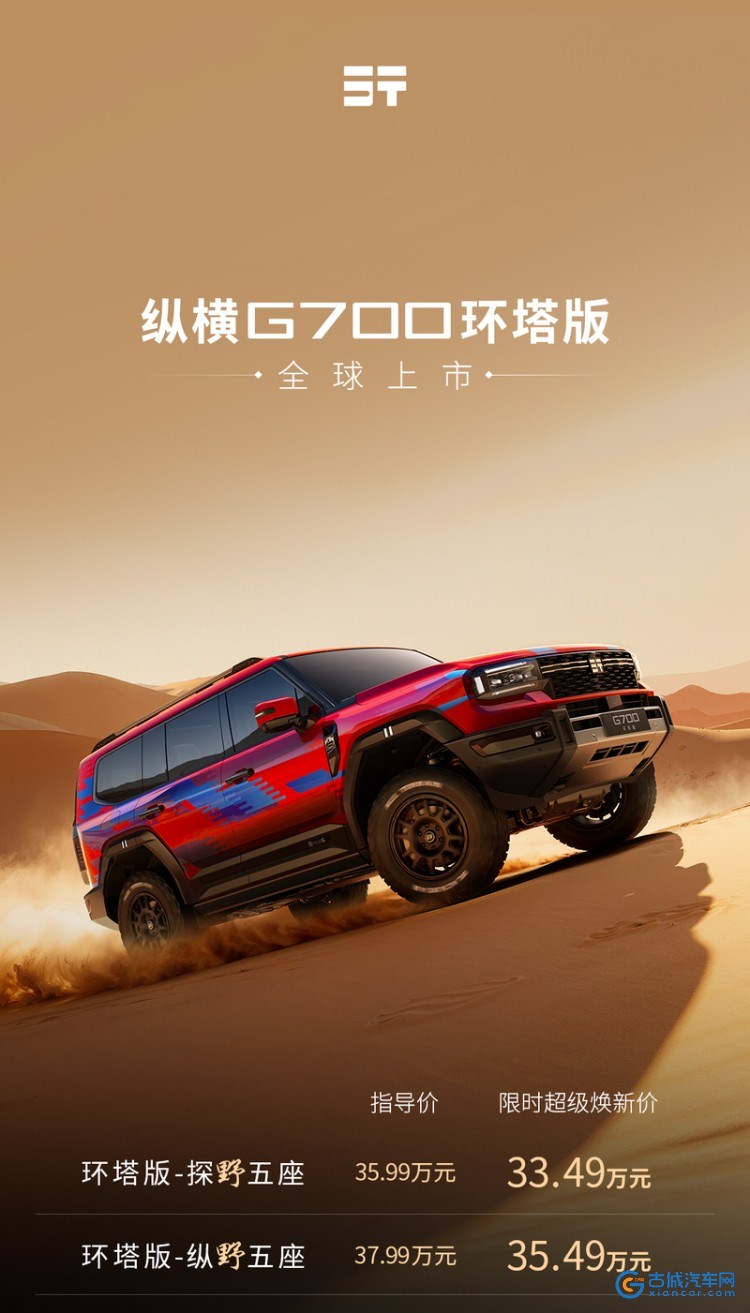 古城汽车网讯 2025广州车展上,纵横G700环塔版正式上市。新车指导价35.99-37.99万元,限时焕新价低至33.49-35.49万元,作为纵横豪华电混越野序列的新成员,它延续了标准版车型的实力,并融入环塔赛事基因。