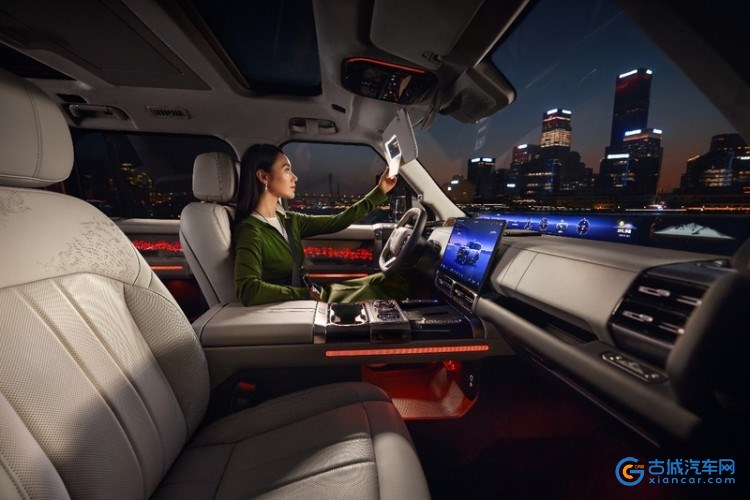 内饰延续豪华布局,三辐式方向盘、怀挡换挡杆操作便捷,15.6英寸中控屏与35.4英寸贯穿屏联动显示信息,后排17.3英寸娱乐屏和8.88英寸空调屏提升体验。副仪表台设无线充电板及物理按键,可控制空调、驱动模式等,“X”标识旋钮调节驾驶模式。座椅提供5座和6座布局,适配不同需求。