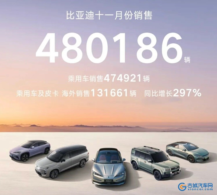 1至11月累计销量数据显示,比亚迪今年前11个月共销售新能源汽车4,182,038辆,同比增长11.30%;其中,乘用车及皮卡海外销售达到916,764辆。