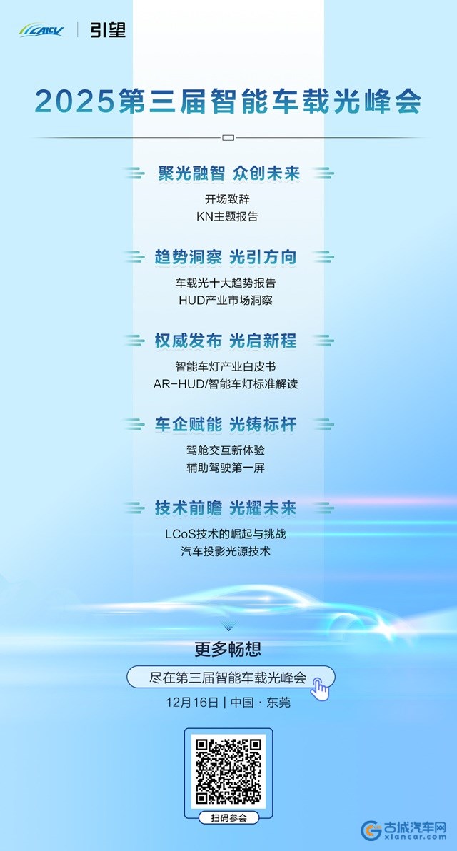 以“聚光融智 众创未来”为主题的2025第三届智能车载光峰会,将于 12 月 16 日在东莞正式召开。本届峰会由中国智能网联汽车产业创新联盟主办,将汇聚行业专家、科研院所与车载光领域顶尖企业,共同探讨车载光技术的创新突破与产业化路径,为中国智能汽车产业的高质量发展注入新动能。