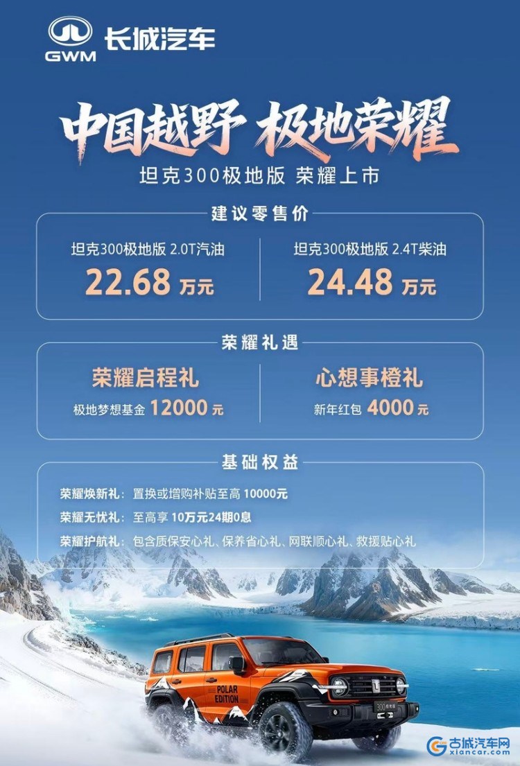 古城汽车网讯 12月11日,坦克300极地版正式上市,新车共推出2款车型,售价22.68-24.48万元,新车限量300辆。新车上市期,长城汽车还推出了荣耀启程礼:极地梦想基金12000元;心想事橙礼:新年红包4000元,以及3重基础权益大礼。