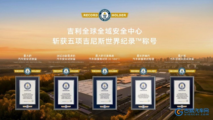 古城汽车网讯 2025年12月12日,吉利全球全域安全中心正式发布,并一举创下“全球最大的汽车安全试验室”、“全球最长的室内汽车碰撞测试跑道”、“全球最大的汽车环境风洞试验室”、“全球最大的任意角度汽车碰撞测试区(0-180°)”、“全球测试功能最多的汽车安全试验室”五大吉尼斯世界纪录。