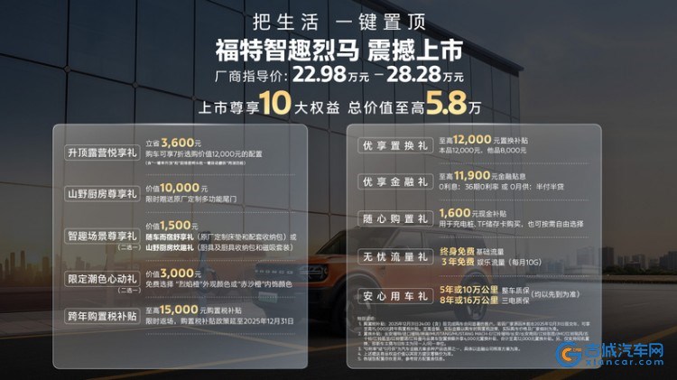 古城汽车网讯 12月19日,福特智趣烈马正式上市,新车共推出5款车型,售价22.98-28.28万元。与此同时,新车还推出了上市10大购车权益,价值至高58000元,包括升顶露营悦享礼、山野厨房尊享礼、智趣场景尊享礼、限定潮色心动礼等。