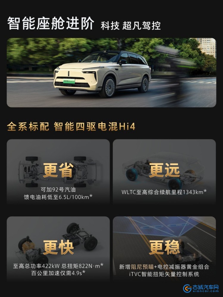 动力方面,新车搭载四挡全速域直驱的Hi4性能版系统,零百加速4.9秒,馈电油耗6.5L/100km,综合续航达到1343km。此外,新车还升级了底盘阻尼预瞄功能,可根据路面情况自动调节悬挂软硬。官方将VLA与Hi4的组合描述为“全链路协同”,旨在提升车辆在不同路况下的稳定性。
