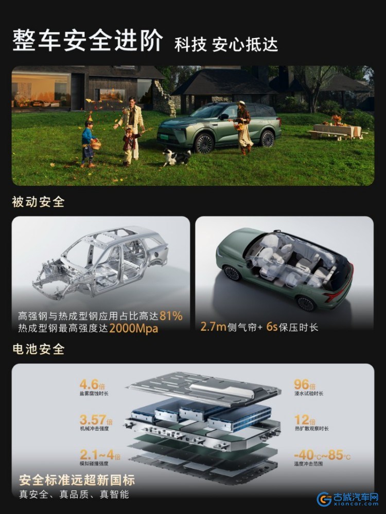 安全方面,新车不但有81%采用了高强钢与热成型钢,关键部位热成型钢强度达到2000兆帕的“硬身板”,还有通过远超国标测试的电池安全保证,其中,模拟碰撞测试的加速度是国标的2倍;盐雾腐蚀测试的时长将近国标的5倍;热扩散观察时长是国标的12倍;浸水时长达国标的96倍。