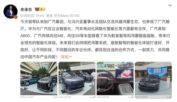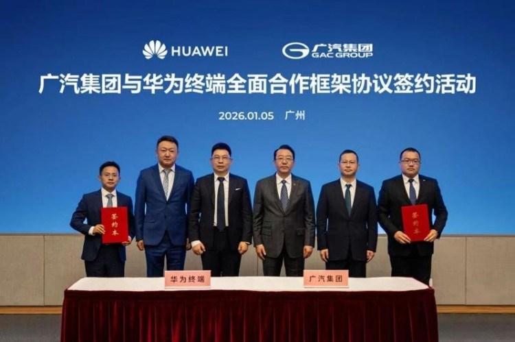 古城汽车网讯 1月5日,广汽集团与华为终端在广汽集团番禺总部签署全面合作框架协议,双方将围绕鸿蒙生态共建与AI前沿技术联合创新展开深度合作,整合各自优势打造全球竞争力的智能出行解决方案,加速中国汽车产业智能化与国际化进程。