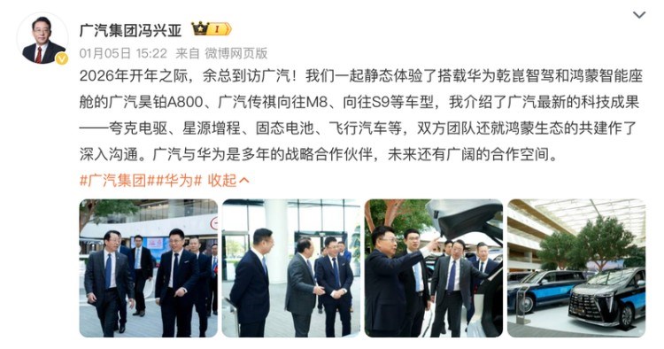 据悉,广汽与华为自2017年首次签约以来,合作已覆盖软硬件、研发制造、高端品牌共建等多个领域,2025年先后推进GH项目公司设立、华望汽车成立及“启境”高端品牌发布等合作。余承东表示,未来将持续优化鸿蒙系统与座舱智驾体验,为车企伙伴提供适配的合作模式;冯兴亚则强调双方未来仍有广阔合作空间。