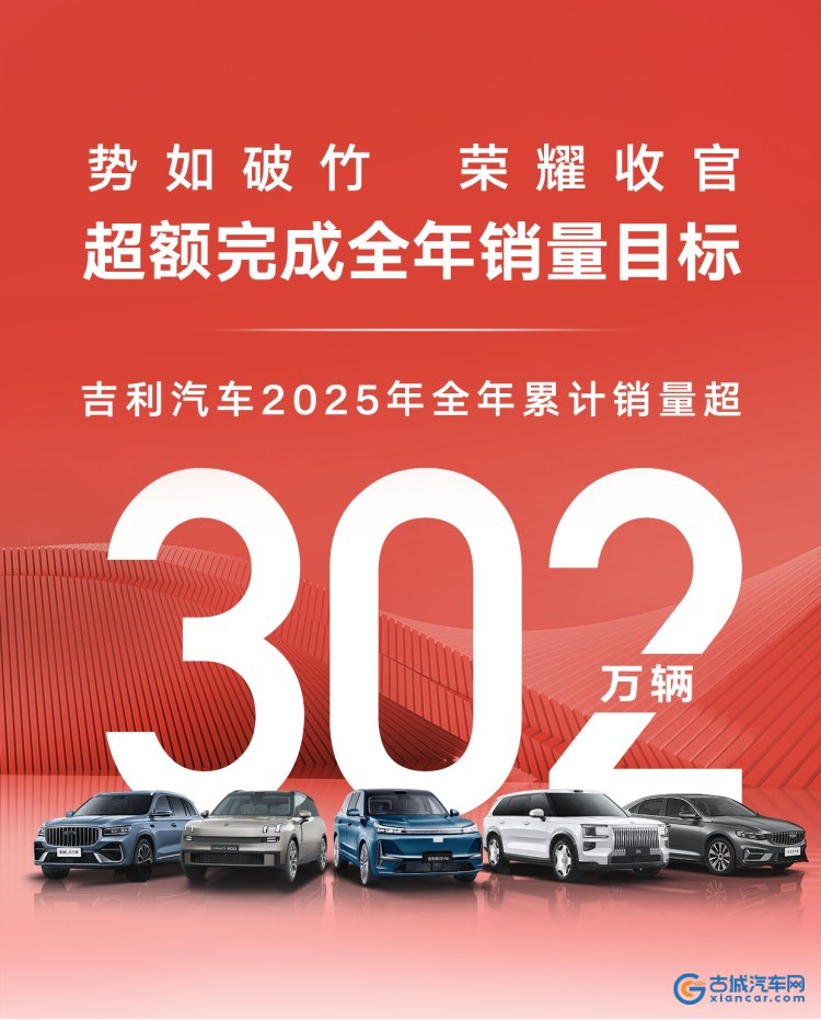2025年,吉利深化践行《台州宣言》,在“一个吉利”战略协同下,实现了新能源全面爆发、全域AI技术赋能、全球化高质量扎根的新跨越,持续引领中国汽车品牌向上突破。2026年,吉利汽车将全年销量目标定为345万辆,其中新能源目标222万辆。