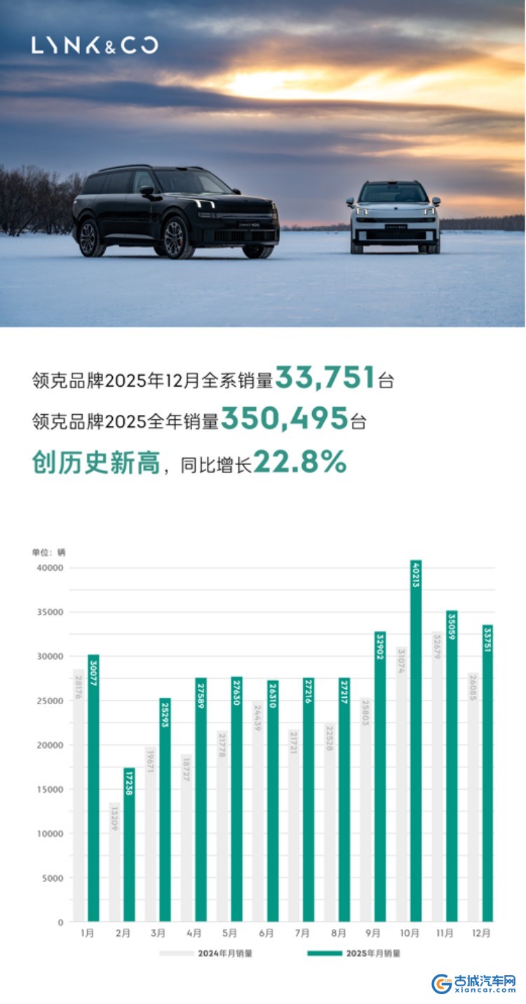 古城汽车网讯 近日,领克对外公布2025年12月销量为33,751台,2025年全年累计销量达350,495台,同比增长22.8%。自2017年首款车型投放以来,领克历史累计销量超过168万台,品牌市占率稳步提升,在充满挑战的市场环境中,展现出极强的发展韧性与增长潜力。