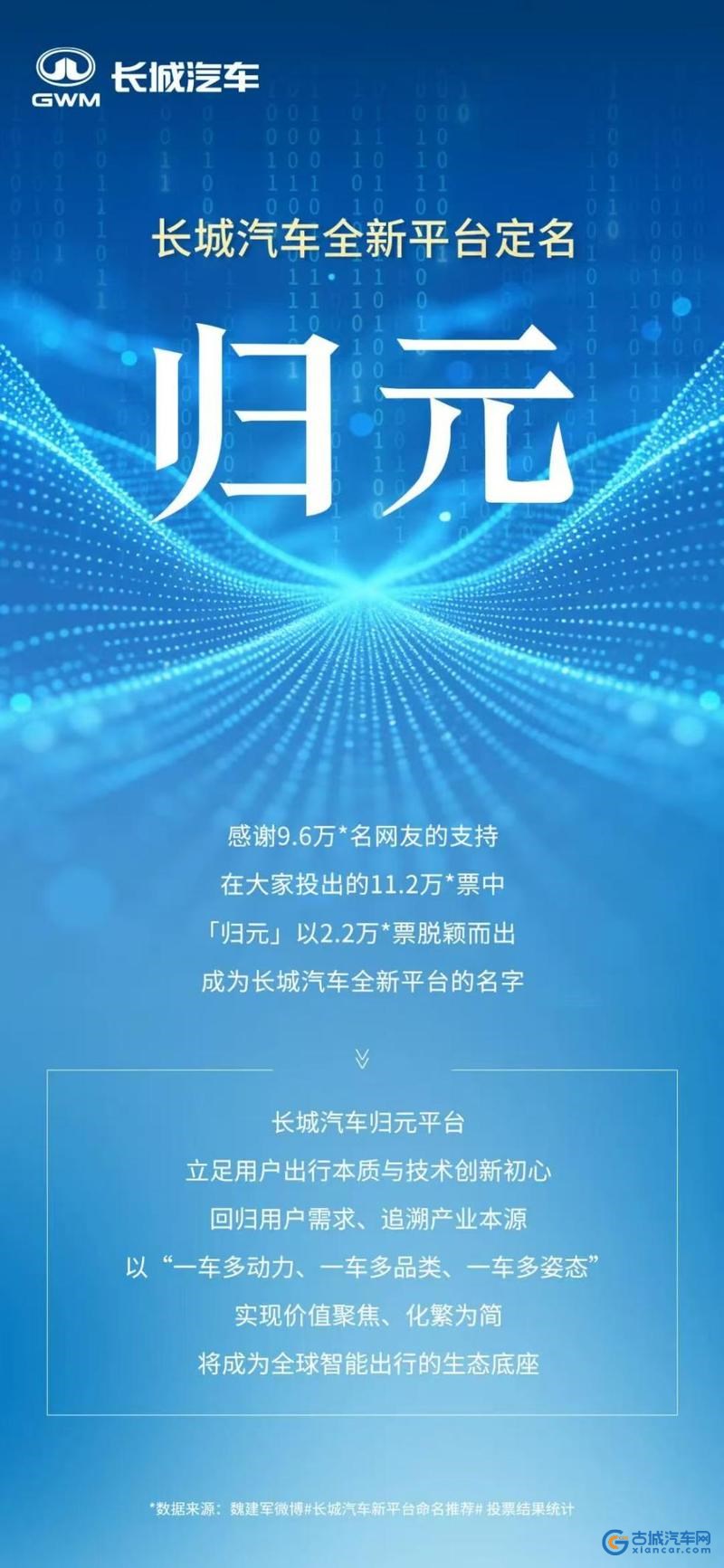 古城汽车网讯 1月6日,长城汽车正式官宣全新战略级整车平台命名为“归元”,这一名称由9.6万名网友投票选出,在累计11.2万票的投票总量中,“归元”以2.2万票的优势胜出。