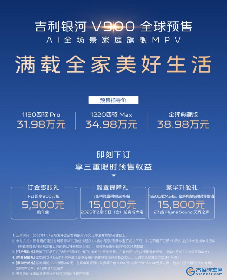 古城汽车网讯 1月7日,吉利银河V900正式开启预售,新车共推出3款车型,预售价31.98-38.98万元。即刻下订,可享三重限时预售权益,包括订金膨胀礼:下订即享900元抵5900元购车金;购置保障礼:用户购置税兜底补贴15000元;豪华升舱礼:1220四驱Max版、金晖典商版限时享价值15800元27扬Flume sound无界之声。
