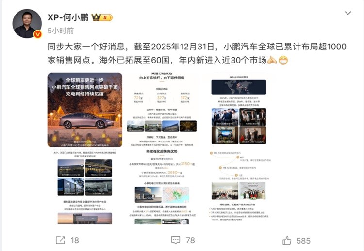 古城汽车网讯 1月20日,据小鹏汽车董事长何小鹏在个人社交平台发布的信息,截至2025年12月31日,小鹏汽车全球已累计布局超1000家销售网点,海外市场拓展至60个国家,年内新进入近30个市场。