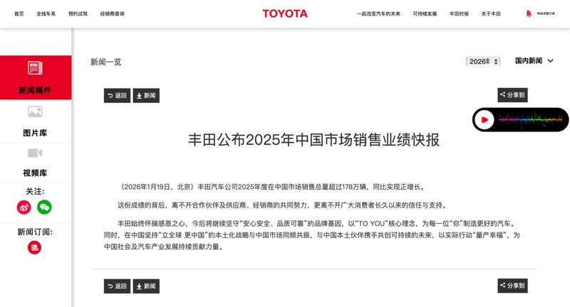 古城汽车网讯 近日,丰田汽车公布2025年中国市场销售业绩快报,全年销量突破178万辆,较2024年的177.6万辆实现正增长,同比增幅达0.23%。在主流合资品牌市占率萎缩、行业竞争加剧的背景下,丰田成为日系品牌中唯一在华保持正增长的企业,表现亮眼。