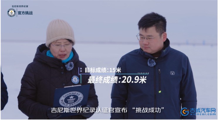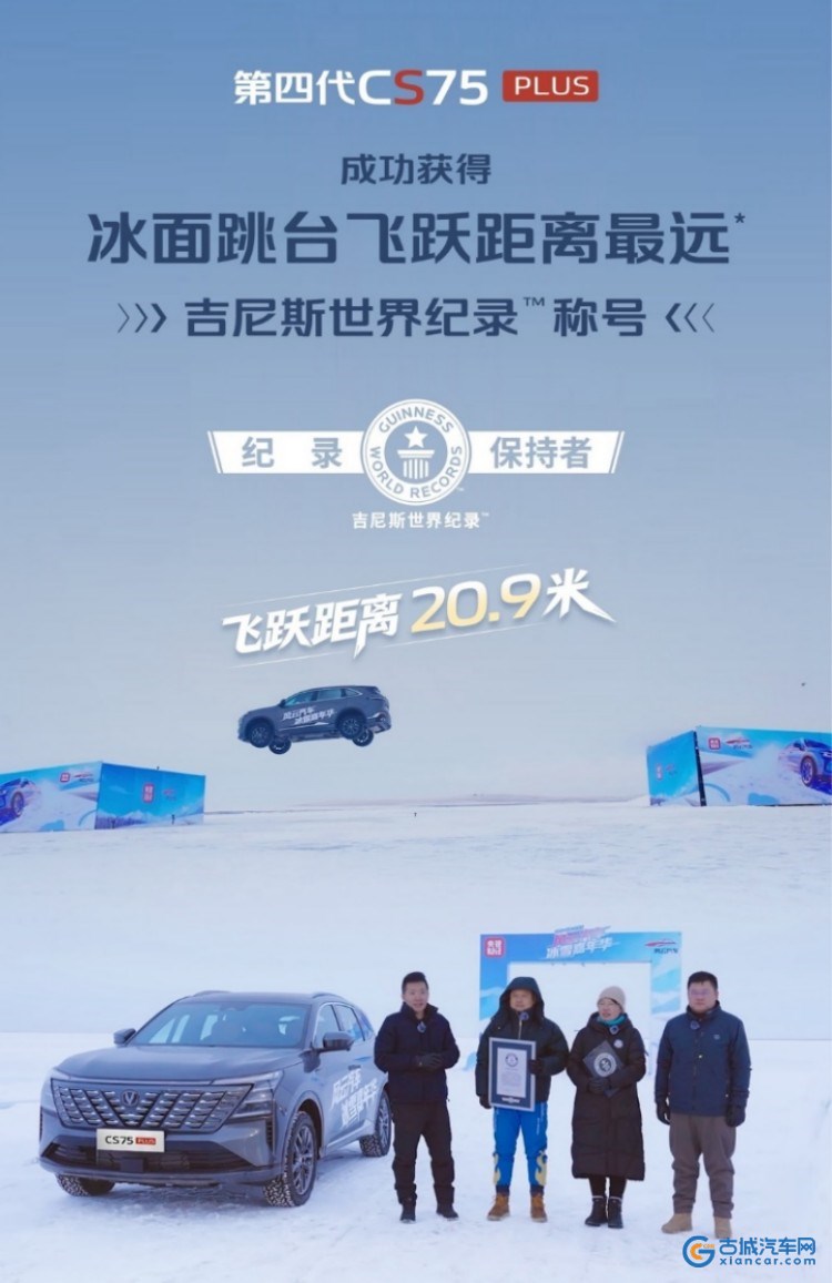 古城汽车网讯 2026年1月,在央视专业测评团队主持人的全程见证,以及吉尼斯世界纪录认证官对飞跃距离的反复严谨核验下,长安第四代CS75PLUS于零下30℃极寒环境中,以最终确认的20.9米成绩成功创下“冰面跳台飞跃距离最远”吉尼斯世界纪录。