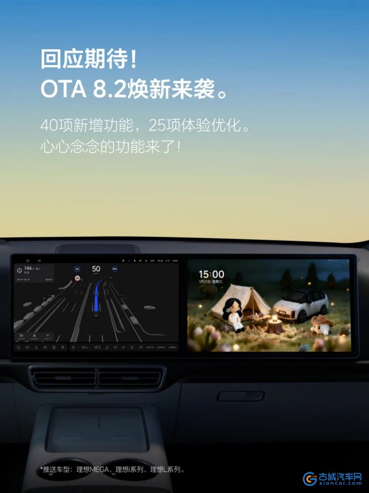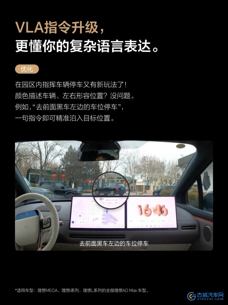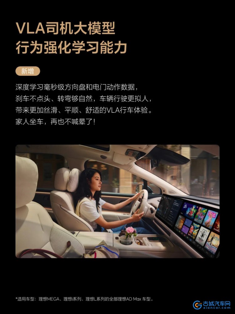 古城汽车网讯 1月21日,理想汽车OTA8.2版本车机系统正式开启推送,辅助驾驶、智能座舱、智能电动迎来升级。VLA司机大模型通过行为强化学习,为拥堵、窄路、人车混行等城区复杂场景下的体验带来质的飞跃。OTA8.2向2022款及之后的AD Max车型推送创新性的VLA充电功能,打通充电最后100米。用户可语音发起导航至理想汽车5C超充站,车辆能够自主完成除插拔充电枪外的充电体验。同时,理想L系列智能焕新版AD Pro车型新增城市NOA,用户在城区内行车更便捷。