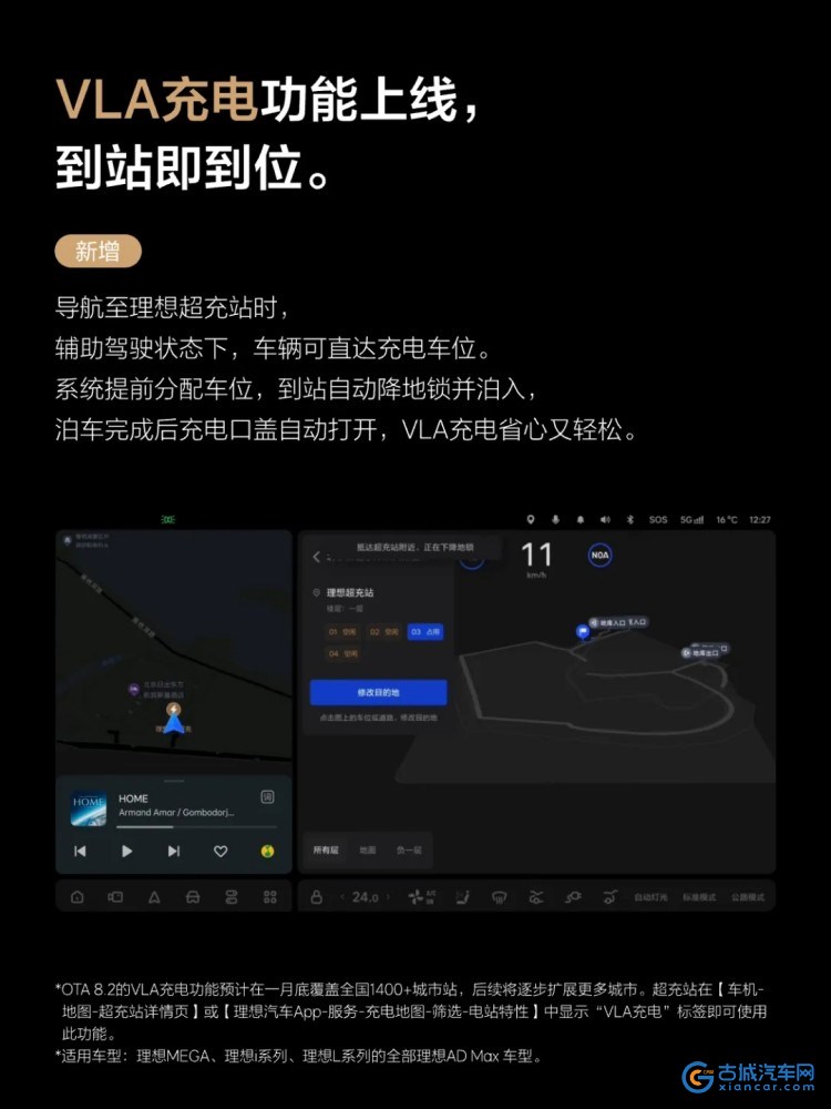 此外,基于“车、桩、站、云”体系化能力,理想汽车将VLA司机大模型的能力进一步拓展,带来全新的VLA充电功能。用户通过语音或地图导航至理想超充站后,系统提前对车位进行自动分配并锁定,车辆可在NOA状态下直达充电车位,抵达后车位自动降下地锁,车辆完成自动泊入并开启充电口。OTA8.2推送后,VLA充电功能将覆盖超过1400座理想城市超充站,后续将逐步覆盖功能范围至全国。