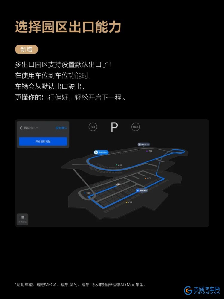 VLA泊车新增支持设置默认园区出口,用户在多个出口的园区中可以设置默认出口,使用车位到车位功能时,车辆会从默认出口驶出园区。同时,车辆在记忆、拓展园区路线时,车机屏幕右上角会显示“记忆中”的状态,便于用户清晰了解当下车辆的状态。P档状态下,用户可以通过车机查看园区3D全览图,并且可以对收藏车位进行管理。