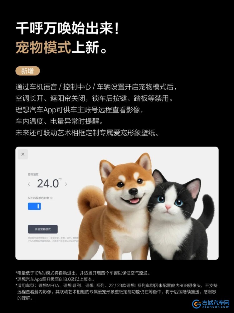 在OTA8.2版本中,智能座舱还重点围绕安全和个性化进行升级。新增宠物模式,为爱宠提供安全、舒适的休息环境,用户可以通过语音指令或手动在车机上一键开启,开启后空调持续运行,车机屏幕、拨杆、门窗按键等功能将被禁用。2024款理想L系列、理想L系列智能焕新版、理想MEGA、理想i系列用户可以通过理想汽车App,远程查看舱内实时影像,时刻观察爱宠在车内的一举一动。