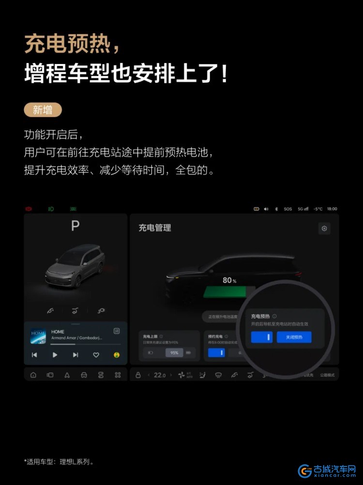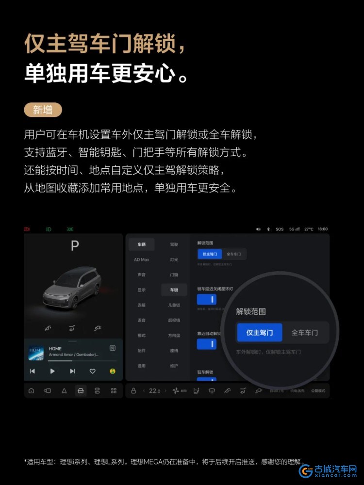 智能电动方面,新增增程车型充电预热功能,理想L系列在导航前往充电站途中将提前预热电池,使其达到最佳充电温度区间,从而有效提升充电效率。理想L系列和理想i系列新增“仅主驾车门解锁”功能,用户可自定义仅主驾车门解锁的时间、地点,提升单人用车场景下的安全性。功能适用于固定时间的单人用车场景,并适用于包含蓝牙、智能钥匙等所有车外解锁方式,用户可以按需选择仅主驾车门解锁或全车车门解锁。