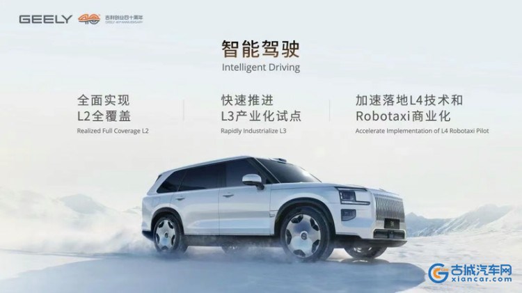 吉利将在法规允许的前提下,将在2026年推送高速L3和城区L4智能驾驶功能,依托全域AI2.0系统与千里浩瀚G-ASD辅助驾驶系统,同时实现Robotaxi的试运营。