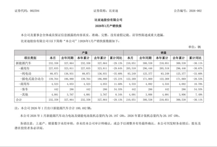 古城汽车网讯 2月1日,比亚迪股份发布2026年1月汽车产销快报,披露当月销量及相关业务核心数据,整体呈现“国内承压、出口发力”的态势,商用车板块逆势增长成为亮点之一。