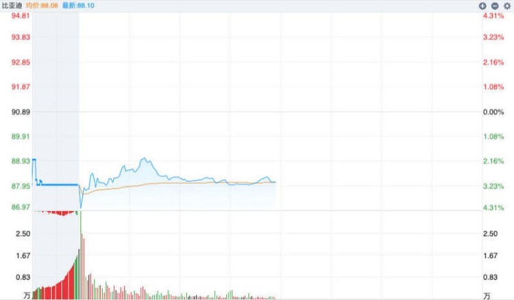 比亚迪1月销量数据披露后,公司股价即刻迎来市场反馈。2月2日,比亚迪(002594.SZ)开盘即走弱,跌幅超3%,开盘后股价继续下探,盘中最大跌幅达4.2%,随后出现小幅回升。截至发稿,其股价跌幅收窄至3.06%,报88.10元/股。